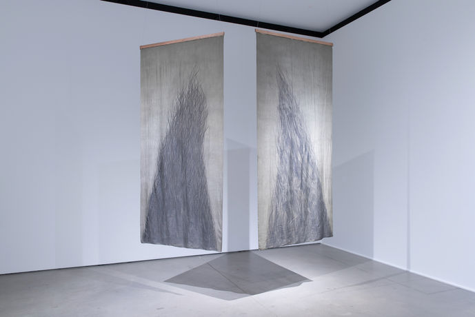 Trained in Chicago as a sculptor and specializing in casting bronze and other metals, Emily Hutchings (USA, born 1992) moved to New Mexico in 2018 where she began to weave and dye with natural pigments. Today, the artist creates textile works that are assertive about their monumental presence in space and their right to exist as sculpture. Coming from the male-dominated world of sculpting, Hutchings makes a statement with her textile translation of a typically hard material visual language. Intrinsic qualities of materials are highlighted, small knitting or weaving movements are magnified, and delicate natural materials and colors are given a more permanent character through treatment with corrosive products. Hutchings’ sculptures remind us that beauty lies in the small things, which she calls “antimonuments,” atypical beacons in space that demand attention for their (mate)reality.