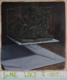 Landscapes rendered with fluid brushstrokes conjure the tiny Belgian village of his upbringing. Handwritten texts disclose interesting substance inside each painting while discreetly conveying his apprehension over climate change and global warming.